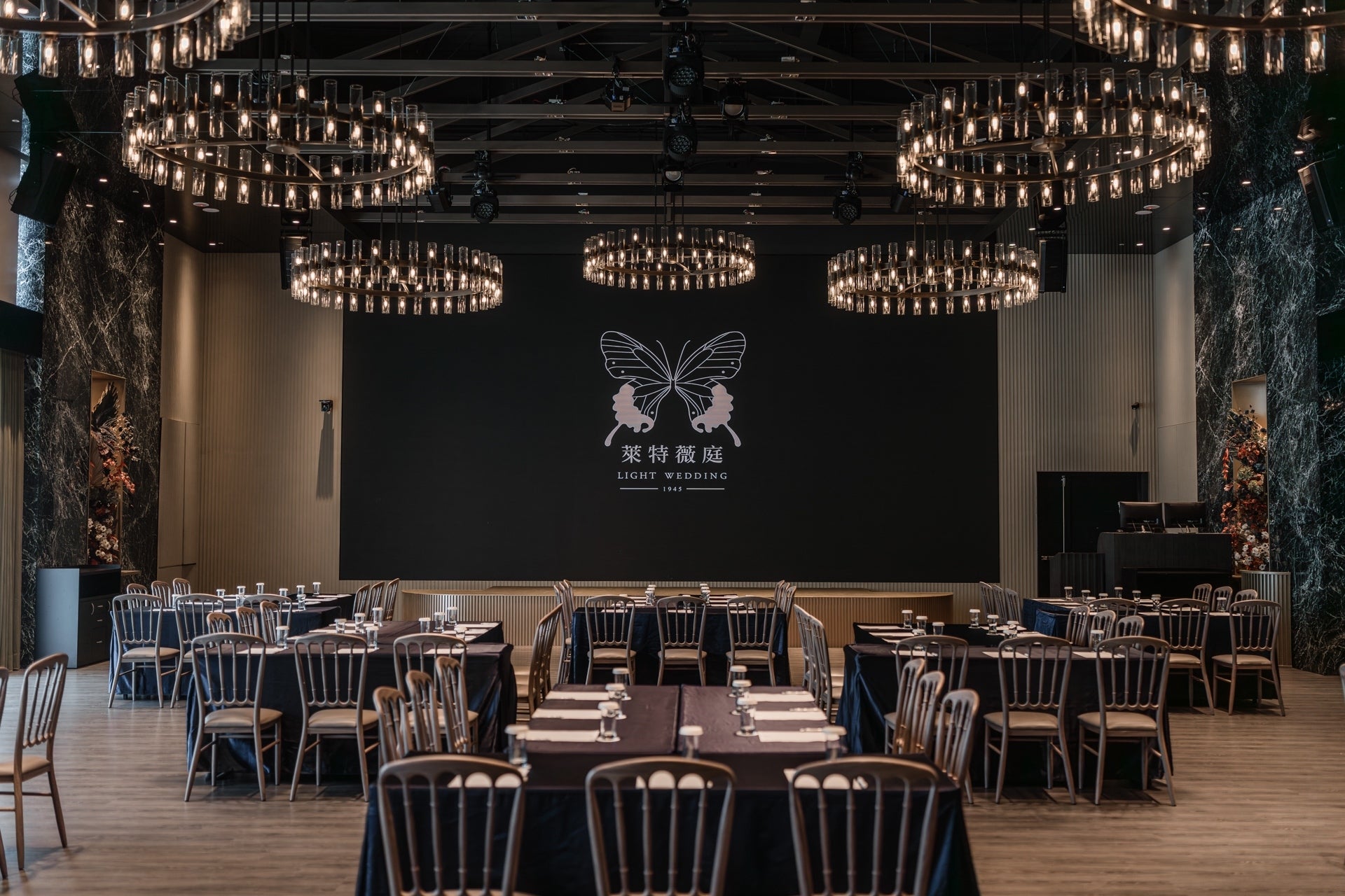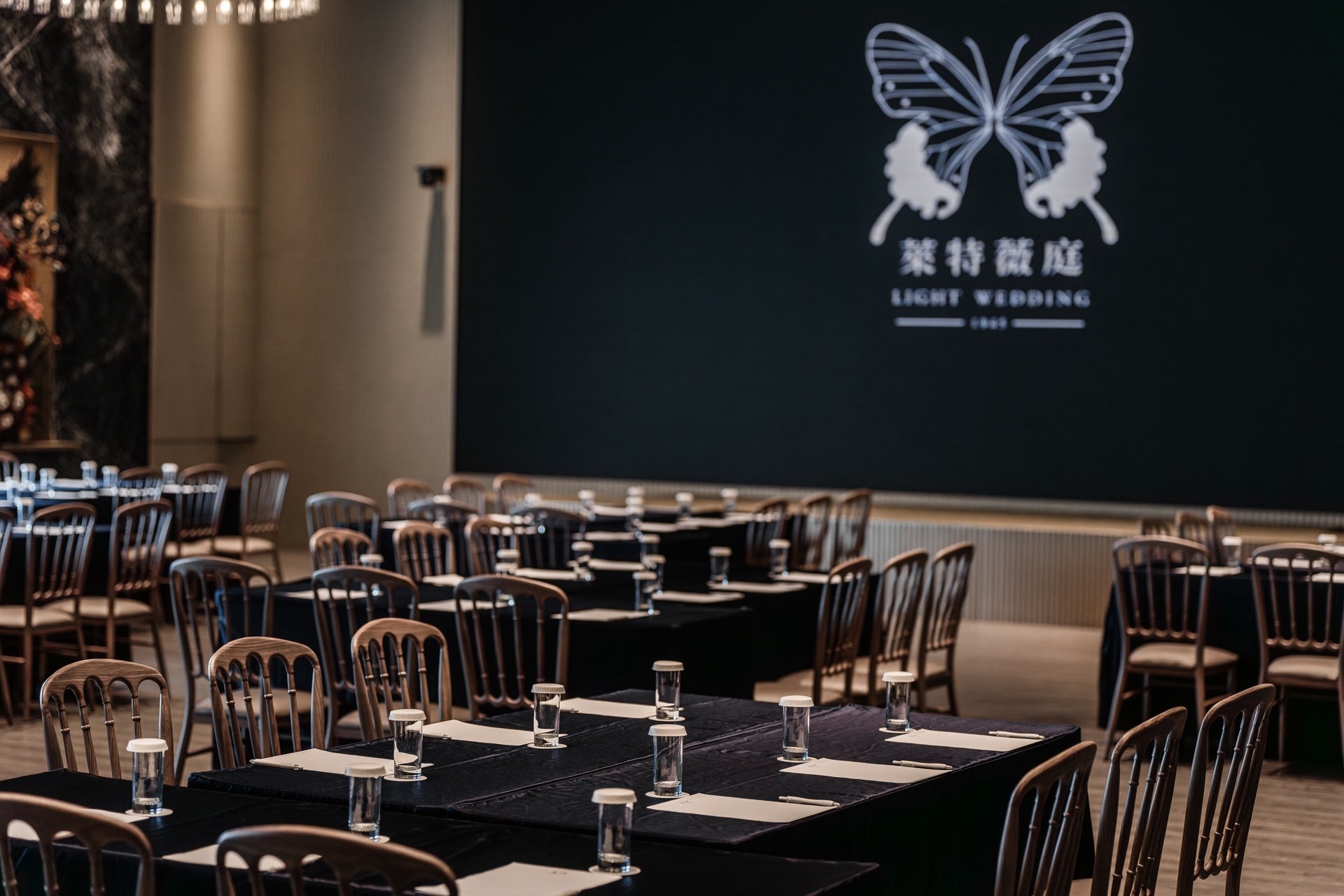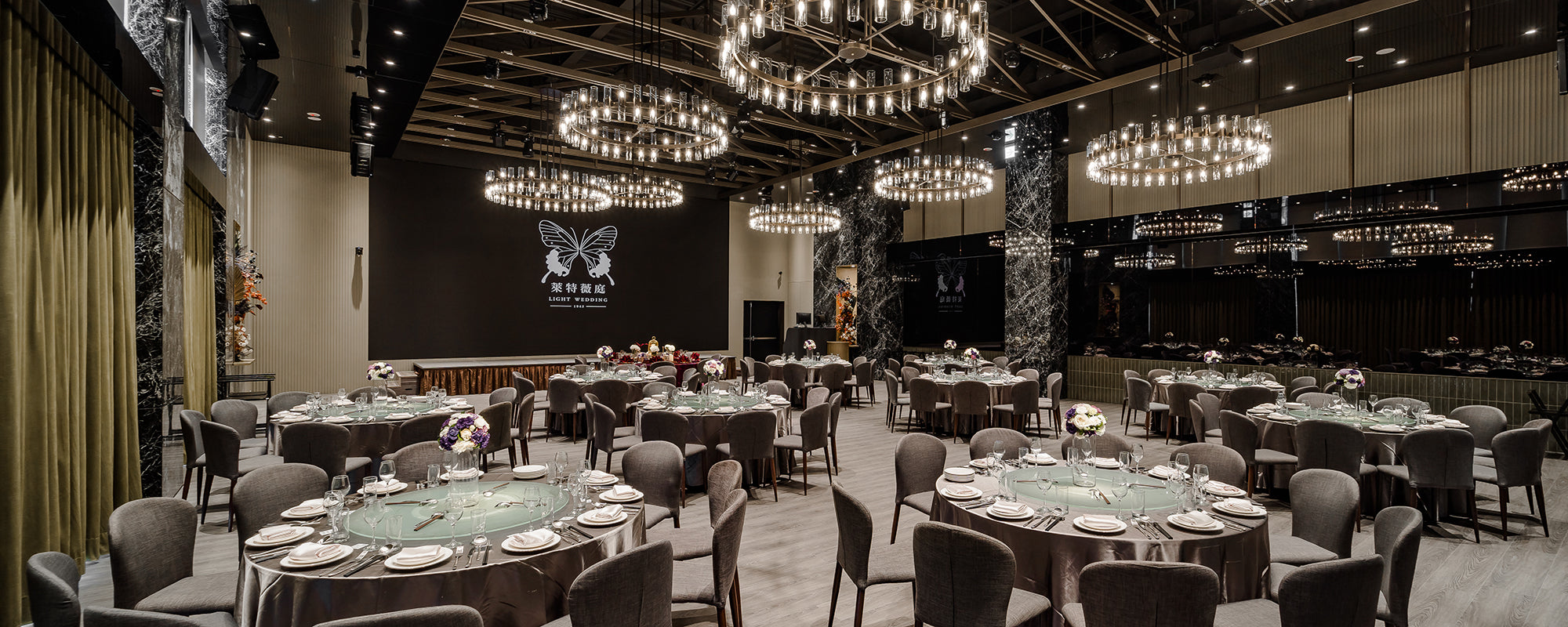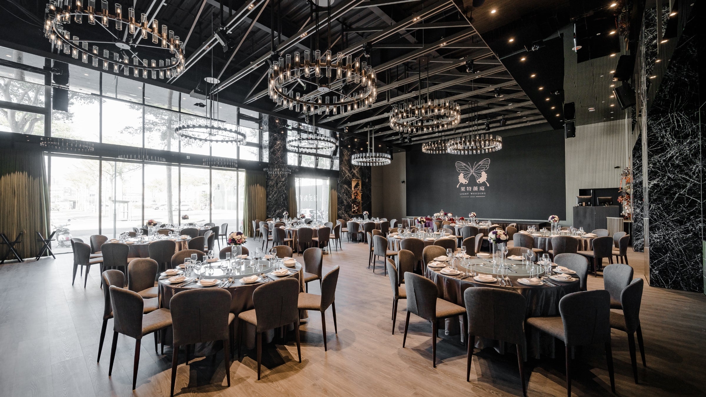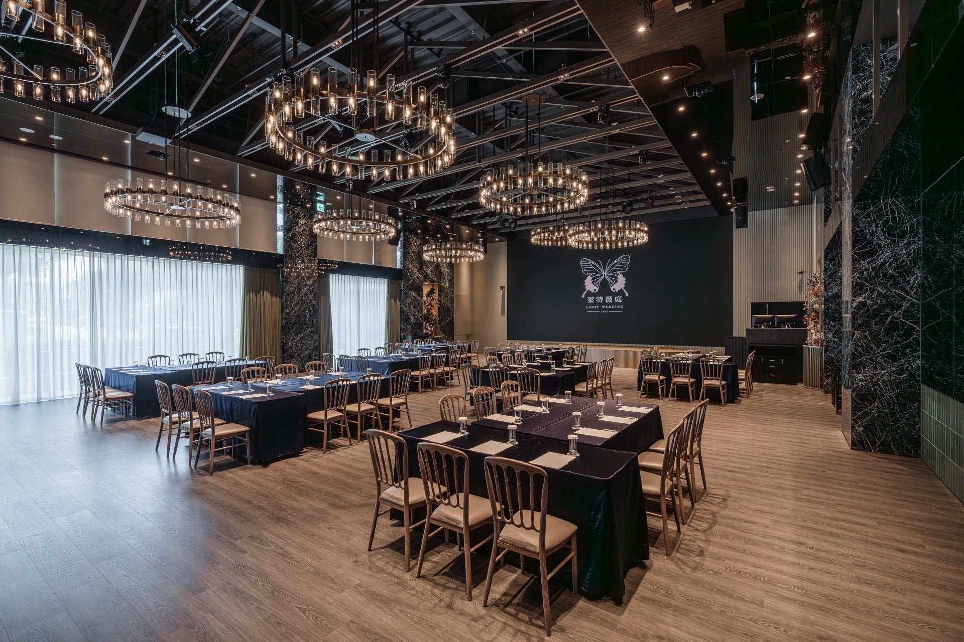 穿過透出綠意的窗和溫和咖啡木質色調的光亮廊道,奢侈的在七期擁有獨立森林系迎賓區。陽光從北面撒進宴會廳內,明亮溫暖而不刺眼,法式工業風吊燈映照著萊特薇庭招牌黑色鏡面,與橄欖綠的牆面呈現出現代摩登的植物園意象。
