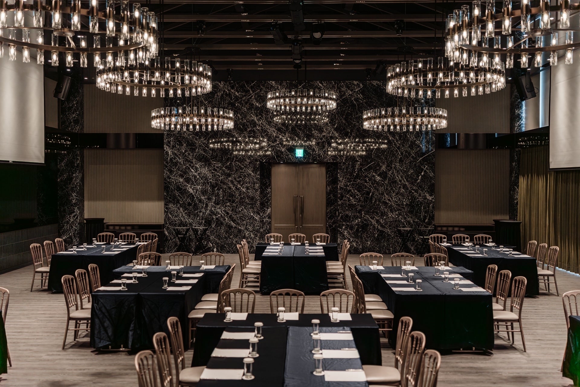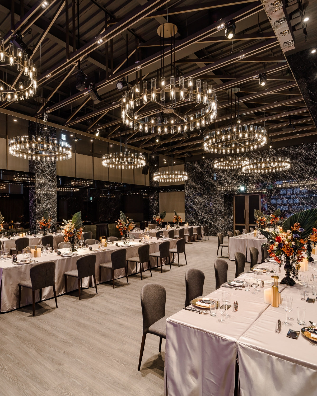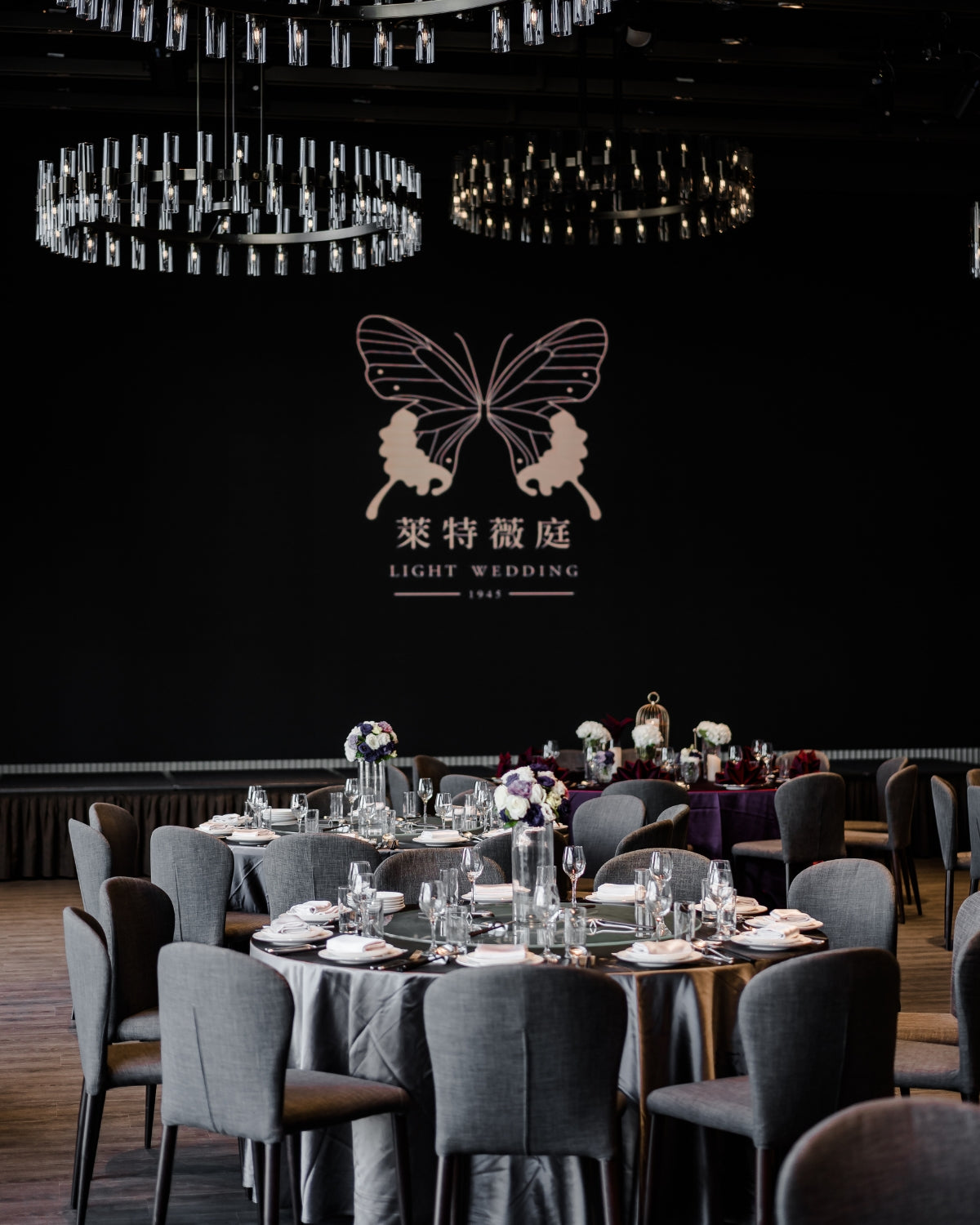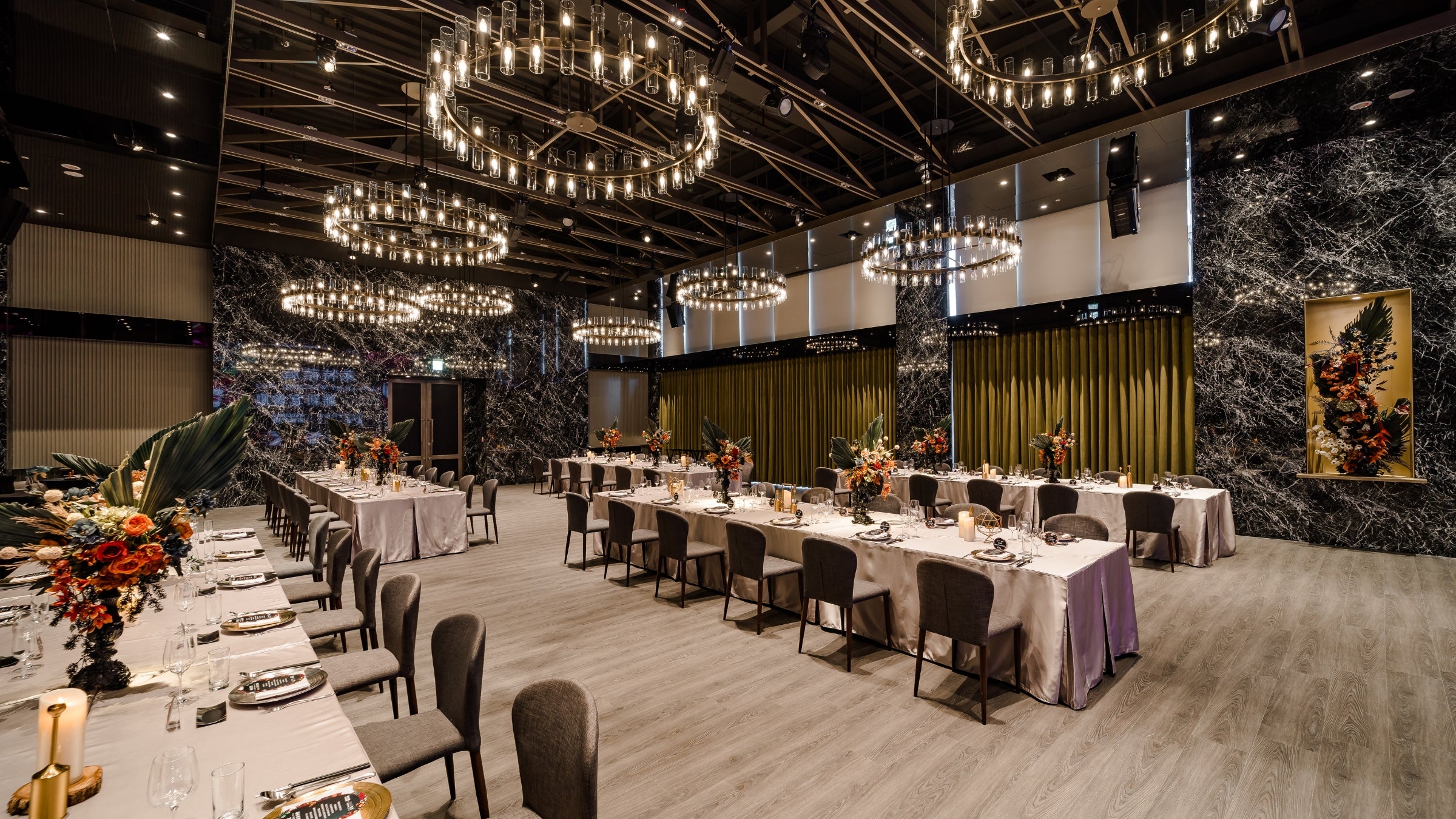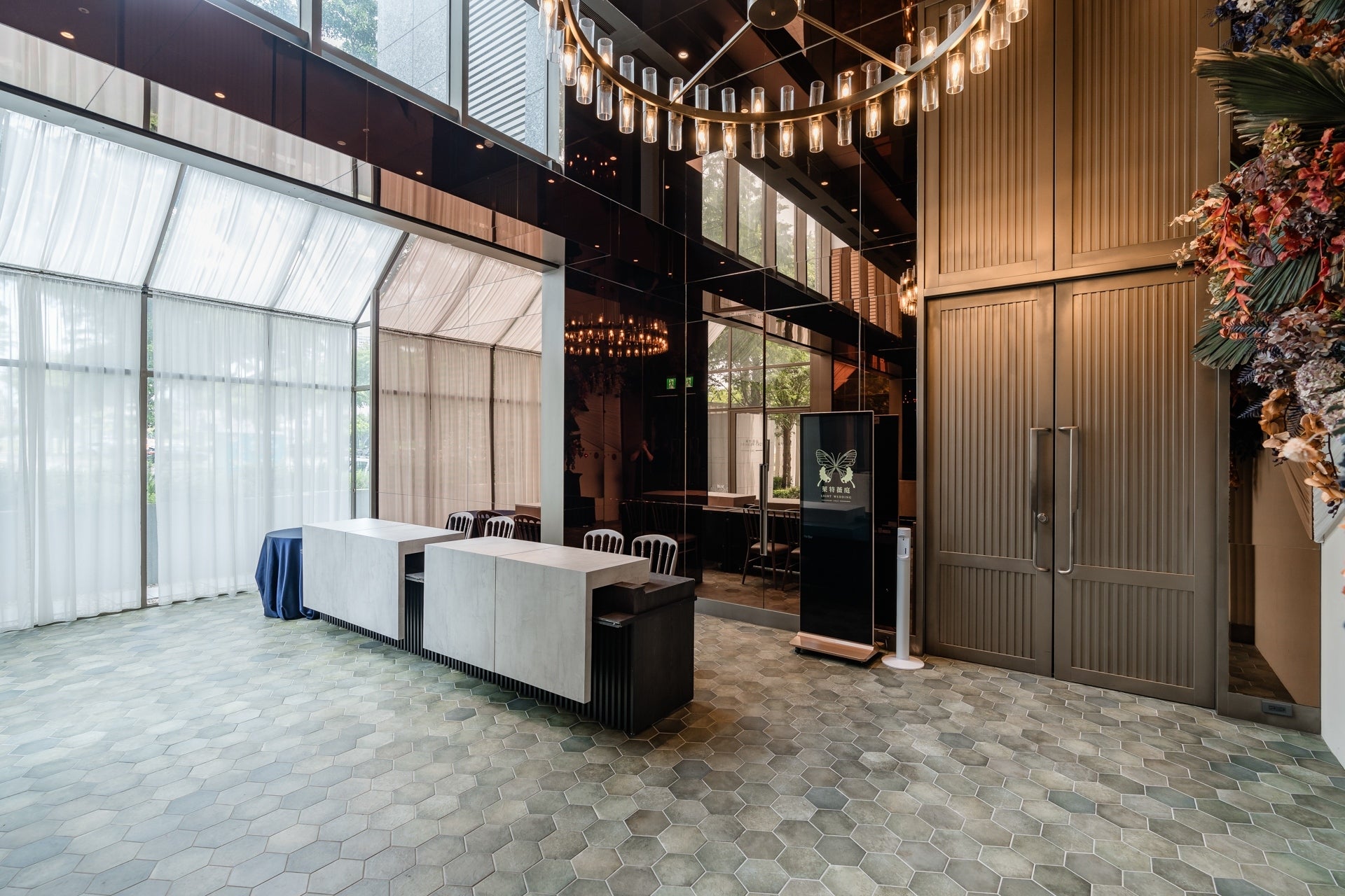 穿過透出綠意的窗和溫和咖啡木質色調的光亮廊道,奢侈的在七期擁有獨立森林系迎賓區。陽光從北面撒進宴會廳內,明亮溫暖而不刺眼,法式工業風吊燈映照著萊特薇庭招牌黑色鏡面,與橄欖綠的牆面呈現出現代摩登的植物園意象。