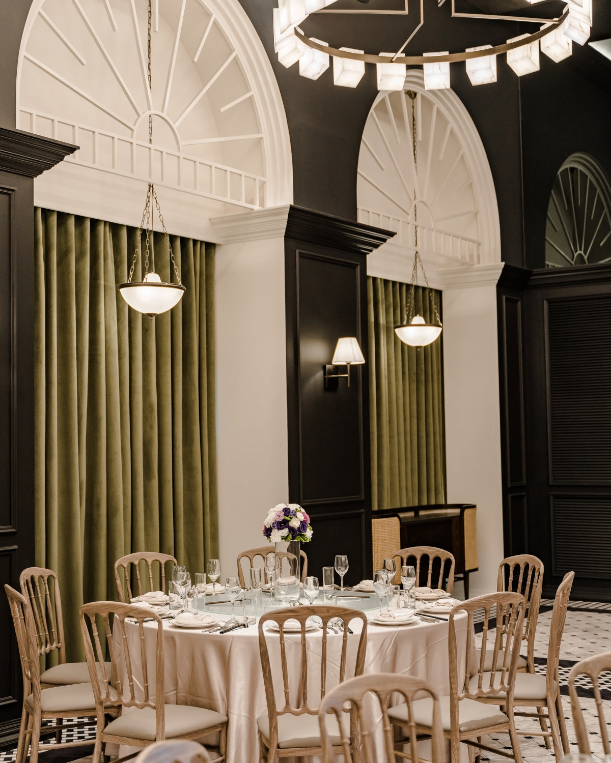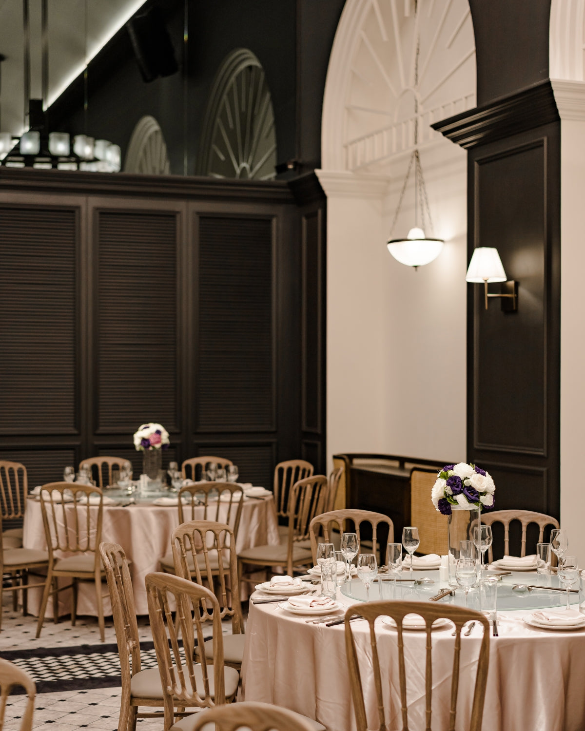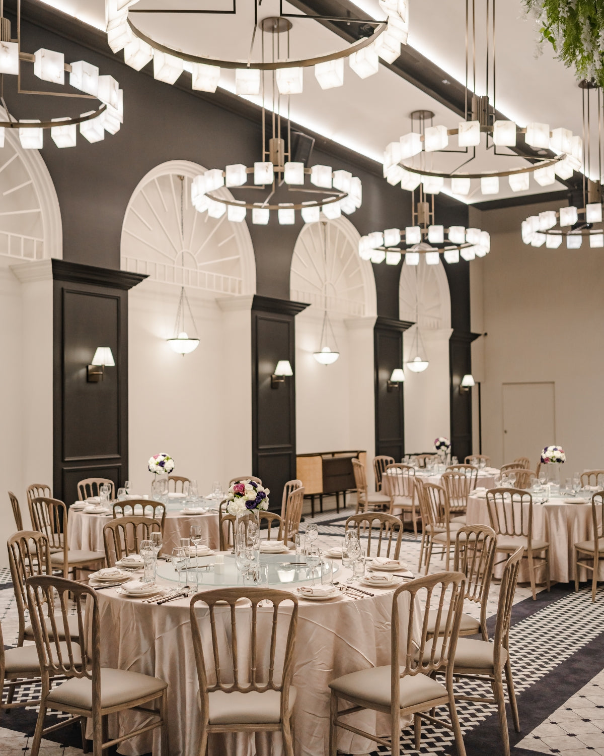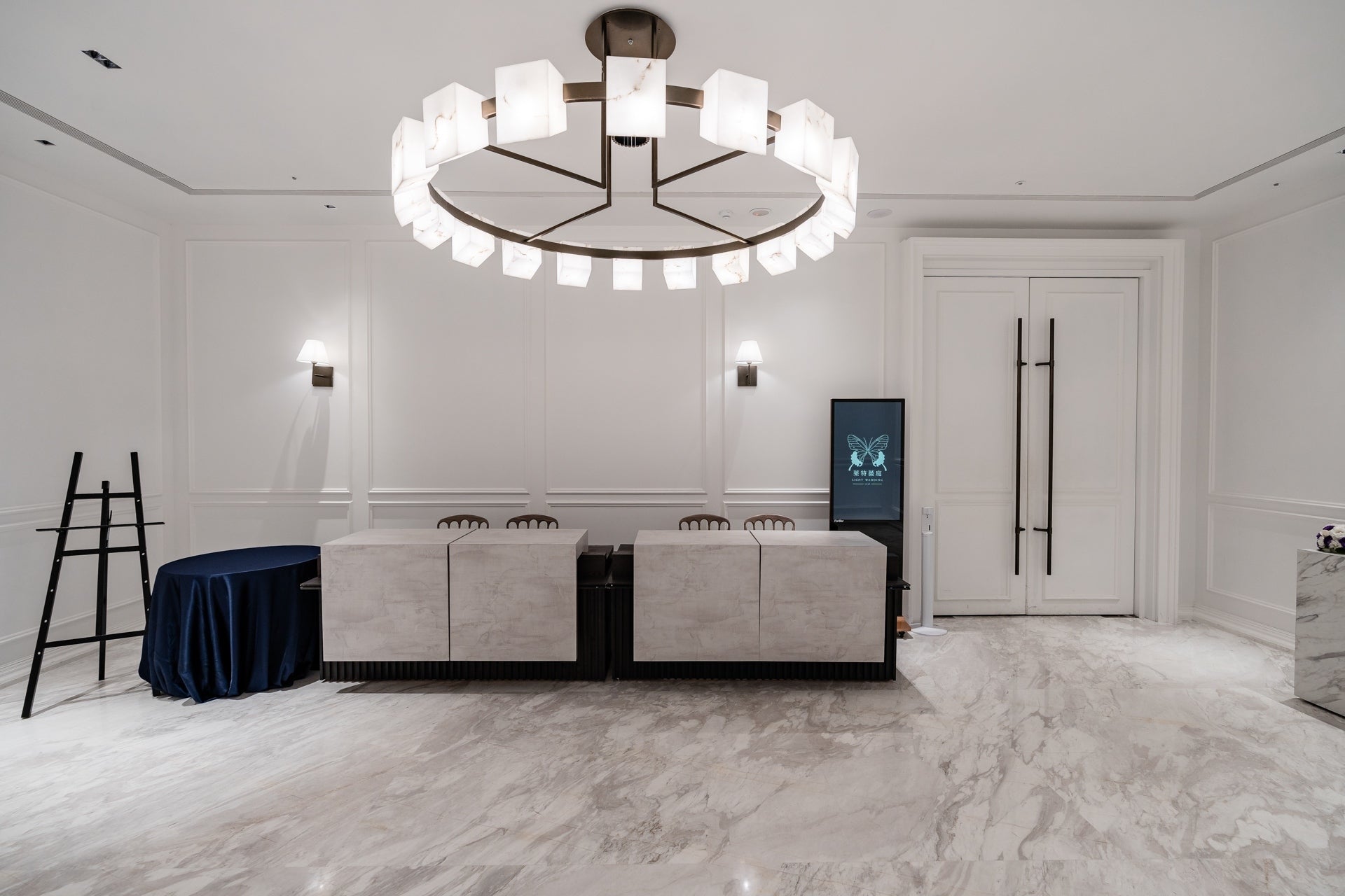 以優雅自在的法式殖民風格為主軸,融合東方的方型元素和西方的線版與拱門,大理石吊燈造型像個婚戒,工藝般的設計,奢華穩重。時髦的設計讓新人眼睛為之一亮。